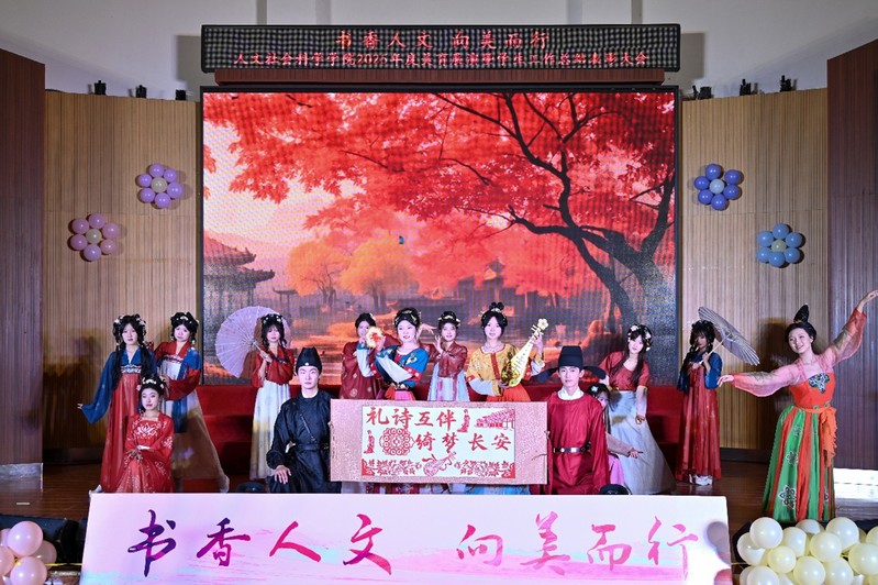 伴随着热情洋溢的舞蹈,美育展演正式拉开帷幕。会上播放的年度工作回顾视频,串联起学院学生工作的各项亮眼成绩与温暖难忘的瞬间,带领在场师生共同重温了这一年深耕不辍的历程与满载而归的喜悦。舞台上,精彩纷呈的节目尽显学院美育工作丰硕成果。学院合唱团带来《一荤一素》《珊瑚颂》《You raise me up》《北大荒人的歌》,悠扬的和声与饱满的情感,彰显了合唱团两年磨一剑的扎实训练成效;《第一天》《一起走》《青春派・舞飞扬》三支舞蹈活力四射,诠释着新时代青年的蓬勃朝气;独唱曲目《我只在乎你》,深情款款,唱出了优秀学子对学校、学院以及恩师同窗的真挚情谊;作为学院美育特色节目,文化礼仪秀《礼诗互伴 绮梦长安》别出心裁,将中华传统礼仪与剪纸艺术、模特表演等元素巧妙融合,以雅致的表演形式赢得全场师生称赞。