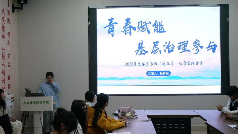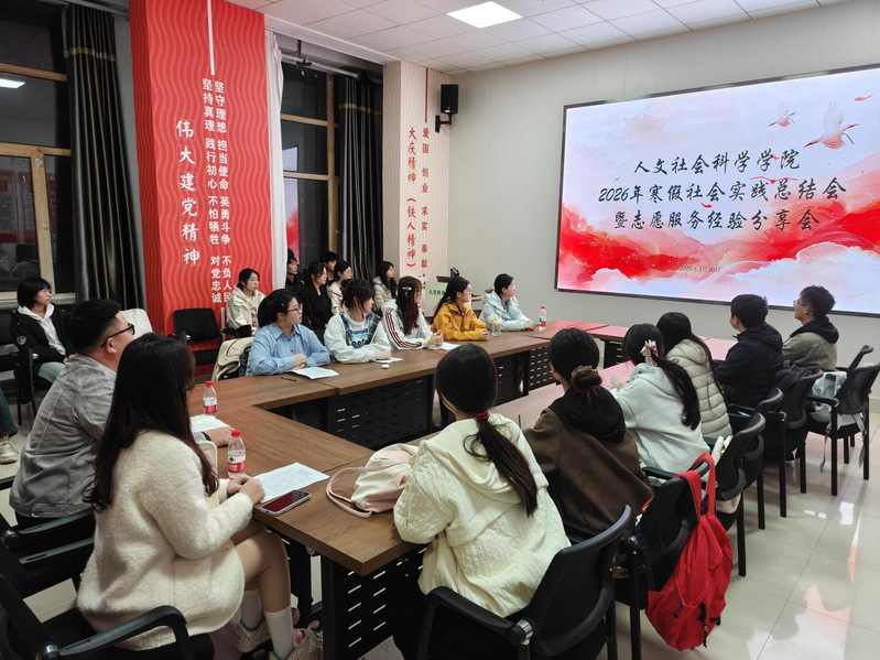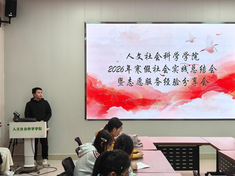 为总结展示寒假社会实践成果,交流志愿服务经验,激励广大学子投身社会、锤炼本领,人文社会科学学院于3月30日举行2026年寒假社会实践总结会暨志愿服务经验分享会。优秀实践团队及个人代表依次登台,生动讲述了他们在广阔天地中的见闻、行动与思考,以专业学识和实际行动展现了新时代青年的责任担当。